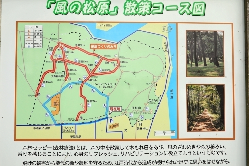21世紀に残したい日本の自然100選、森林浴の森日本100選などに選出された功績が示すとおり、森林セラピーの効果も期待できる空間を肌で感じられます。風の松原にはコースがいくつかありますが、大森稲荷神社など散策スポットもいくつかあり、初めて訪れるのであれば自由に散策するのがいいでしょう。