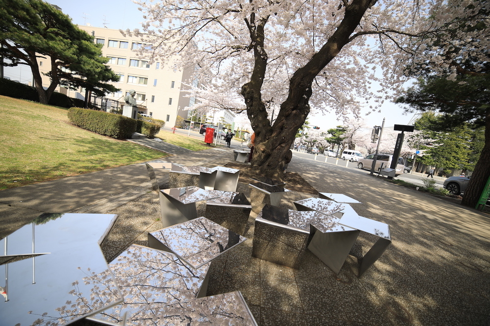 日本の道100選に選出されている青森県十和田市の「官庁街通り駒街道」。特に桜の時期は素晴らしい道となり、ここを訪れるものを魅了する。また、素晴らしいのは桜並木だけではなく、この官庁街通り駒街道の両側にある現代アートの野外作品にも当てはまる。