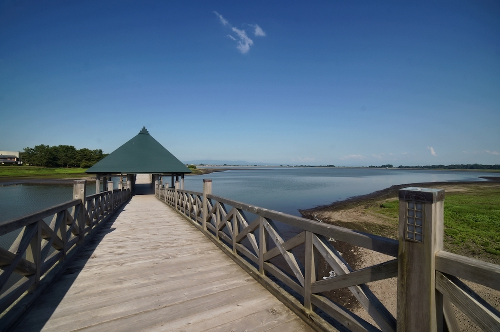 コースの東側の岩木川を渡れば、至る所で鶴をモチーフにしたものを見かけるでしょう。岩木川の河川敷には大きな鶴の像が2体。陸奥鶴田駅の駅舎の屋根部分は鶴のような型をしています。この駅前では和菓子やアイスといったスイーツで小休憩をするのもいいでしょう。