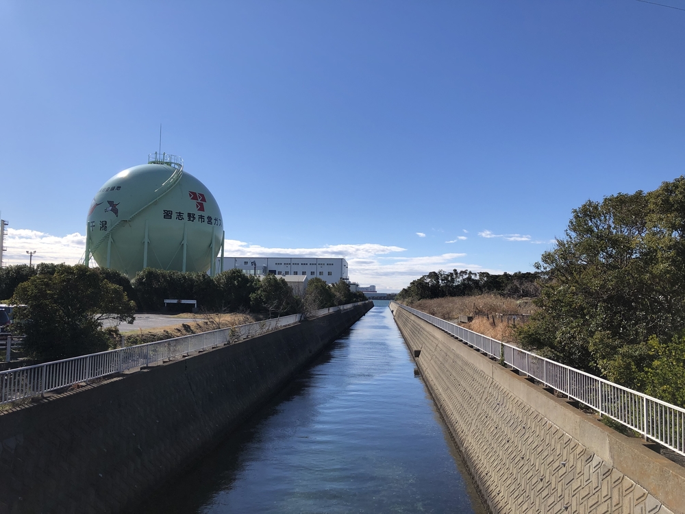 習志野海浜霊園から海辺の遊歩道に入り、千葉マリンスタジアムに向かうルートです。