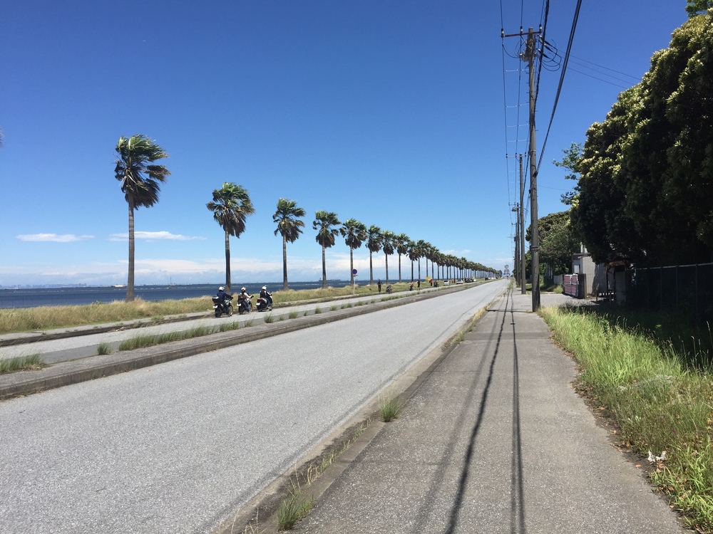 最初はアクアラインを目指しながら浜焼き屋などの食堂やキャンプ場を横目に気持ちよく走れます。さらに途中には、港の広場に休憩所もありつつ、民家やさざなみ公園など走りやすいところを抜けて行くと、最後の約1.3kmは袖ヶ浦海浜公園へと続くまっすぐ伸びた千葉フォルニアと呼ばれる椰子の木が綺麗に立ち並ぶとても良い雰囲気のロードです。往路のゴールとした公園のシンボルである高さ約25mの展望塔からは、東京湾アクアラインや海ほたる、天気の良い日には対岸の街並みや富士山、東京スカイツリーも望めます。