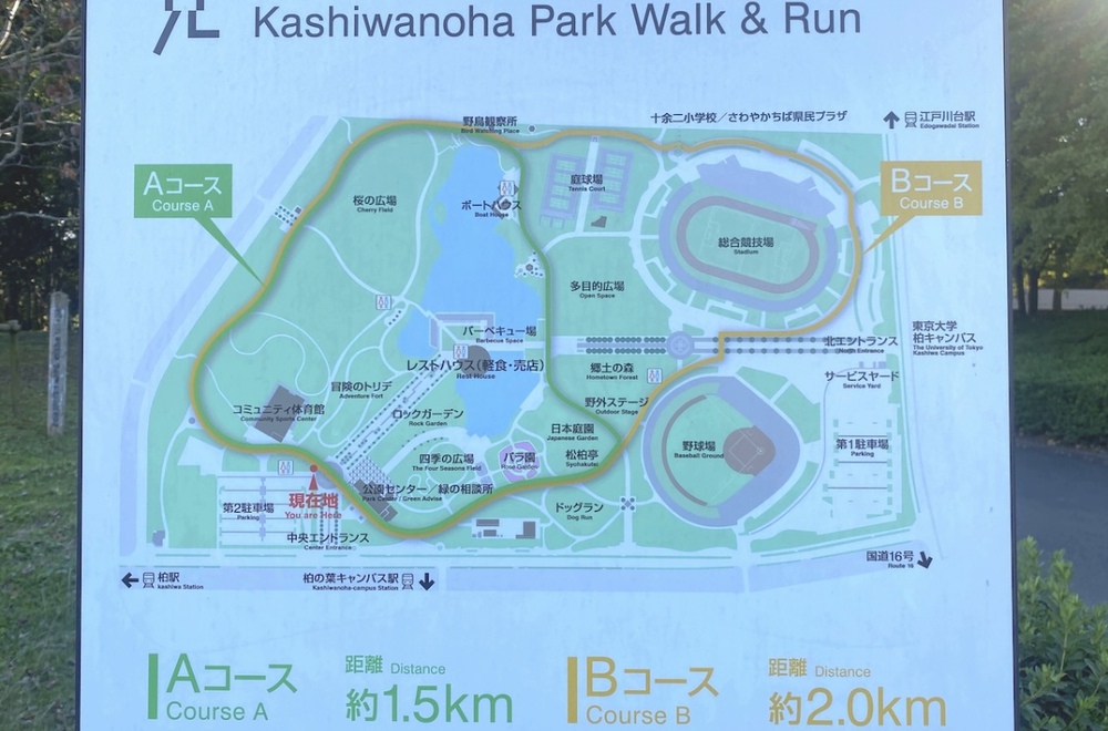 柏市北西部の「柏の葉公園」には陸上競技場や野球場以外にも400mのジョギングコースや2種類のウォーク&ラン周回コースがあります。
