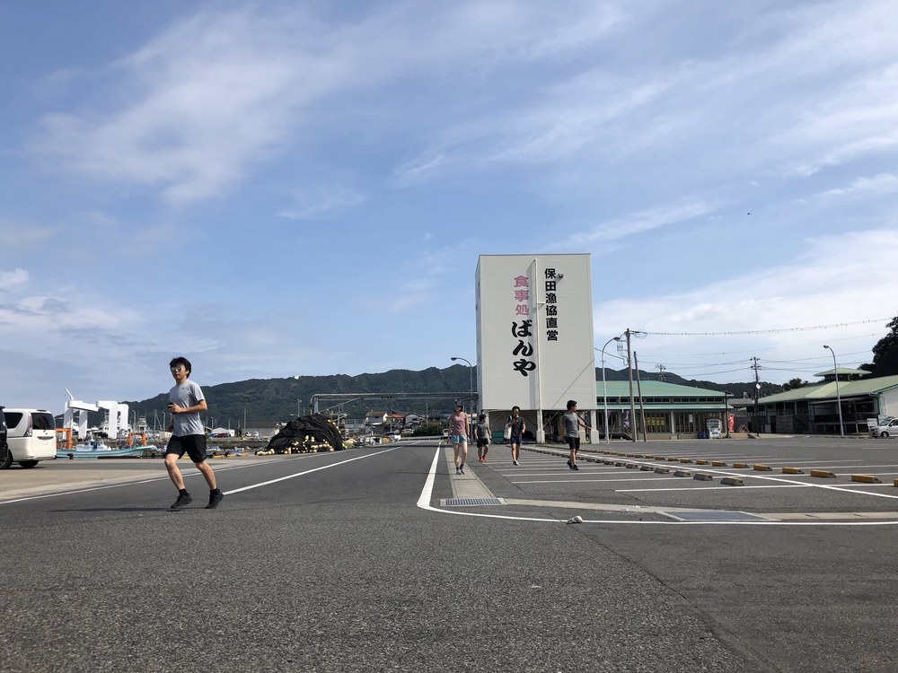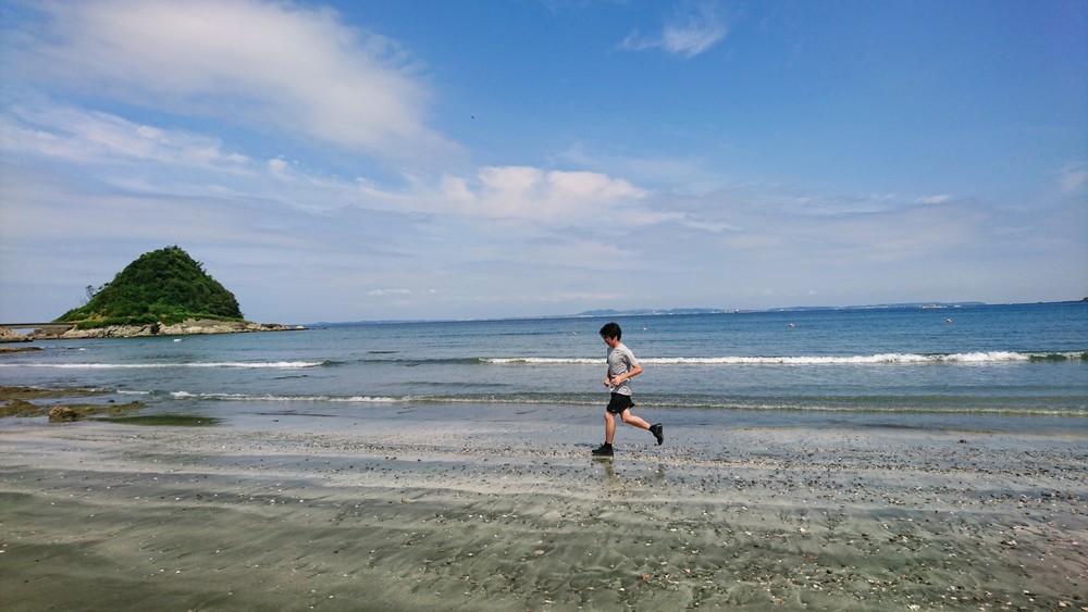 ビーチコーミングで有名な勝山海水浴場を目指します。経由する大六海水浴場も広くて綺麗なビーチ。砂浜につく足跡は、ランニングを楽しくしてくれるスパイスですね。