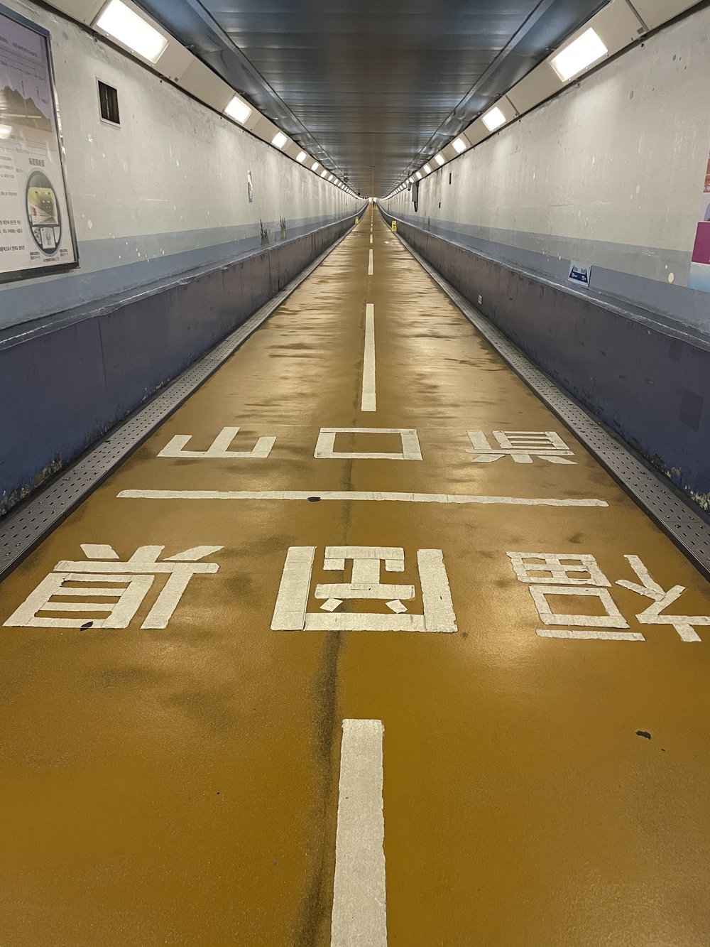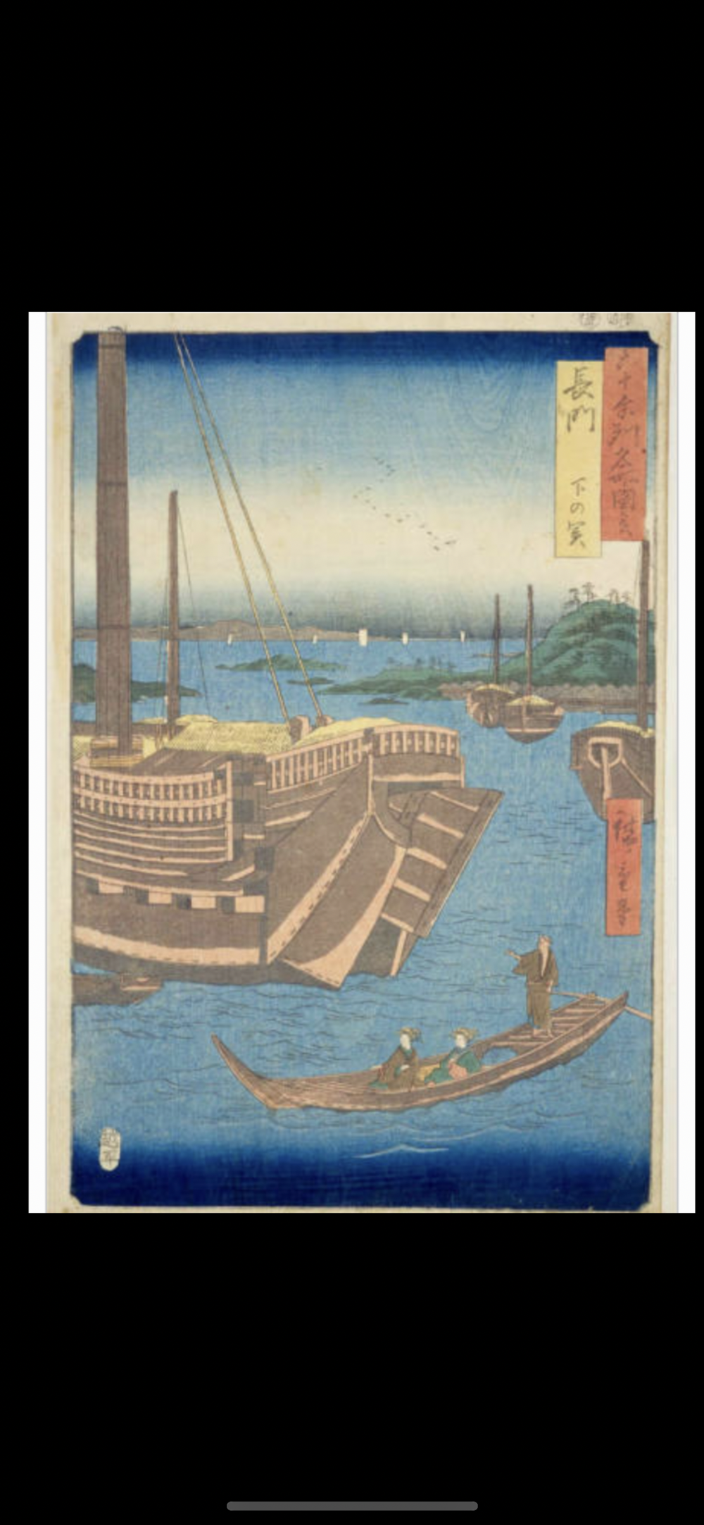 下関に寄港した廻船と、惣嫁船と呼ばれる小船を描いた作品です。惣嫁とは、沖に停泊する廻船に赴いて客をとる遊女で、飯炊きや洗濯などの家事一切までこなしたとの事です。展望台から、関門海峡や巌流島を眺めた後、念願の「関門トンネル人道」を走ります。1km足らずの距離ですが、福岡県と山口県の県境を、海底のその下に位置するトンネルを走る機会は、滅多に無いので大変楽しいRUNでした。(下関RUNに続く)