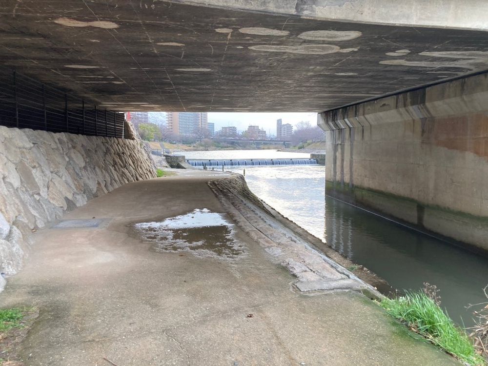 私は何も知らず、行きは右岸を走りましたが、左岸の方が途中で河原の歩道が途切れないのでおすすめです。右岸は竹下駅を過ぎたあたりで一度道路に上がります。