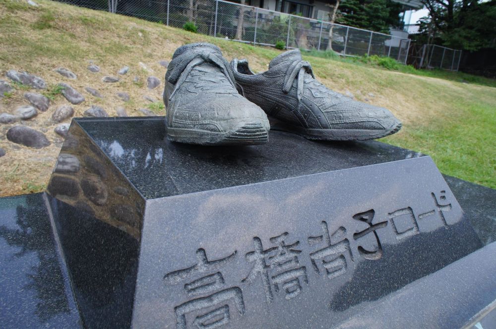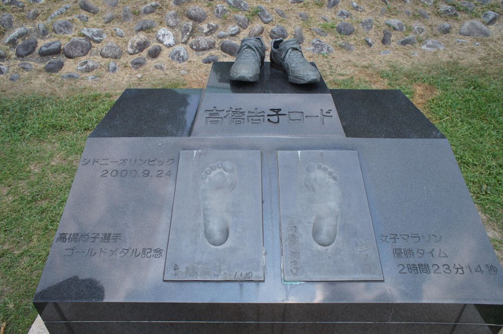 コースのスタート地点には高橋尚子さんの足型とシューズのモニュメントが飾られています。