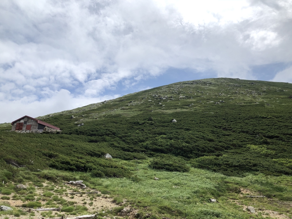 この辺りから、大きなきがなくなりハイマツの尾根伝いに歩く。緩やかなアップダウンで歩きやすい。双六小屋には水洗トイレがあって驚いた。