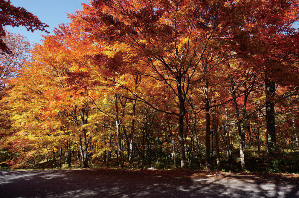 起伏が激しいコース。北アルプスと周りの山々の雄大な景色と紅葉を見ながらのランニングになります。クライマックスは、笠ヶ岳、錫杖岳を望む絶景スポットの「北アルプス大橋」。疲れたら途中の足洗いの湯で小休止。一般道かつかなりの高低差になりますので、上級者向きです。
