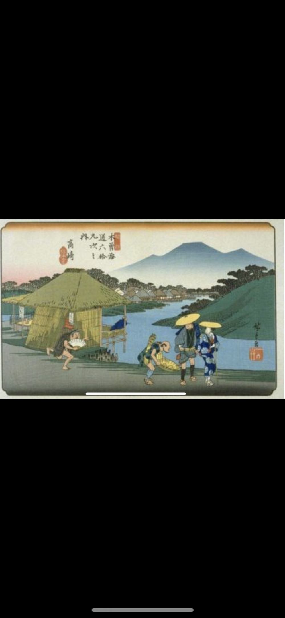 広重の「高崎宿」を巡ります。木曽海道六十九次之内の1つ、高崎宿は、群馬県高崎市の鳥川と碓氷川の合流地点から榛名山を眺めている風景となります。旅人から物乞をしているこの描写は、珍しい作品内容ではないかと思われます。色々な裏事情が読み取れるようです。
