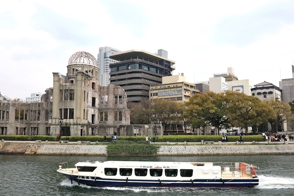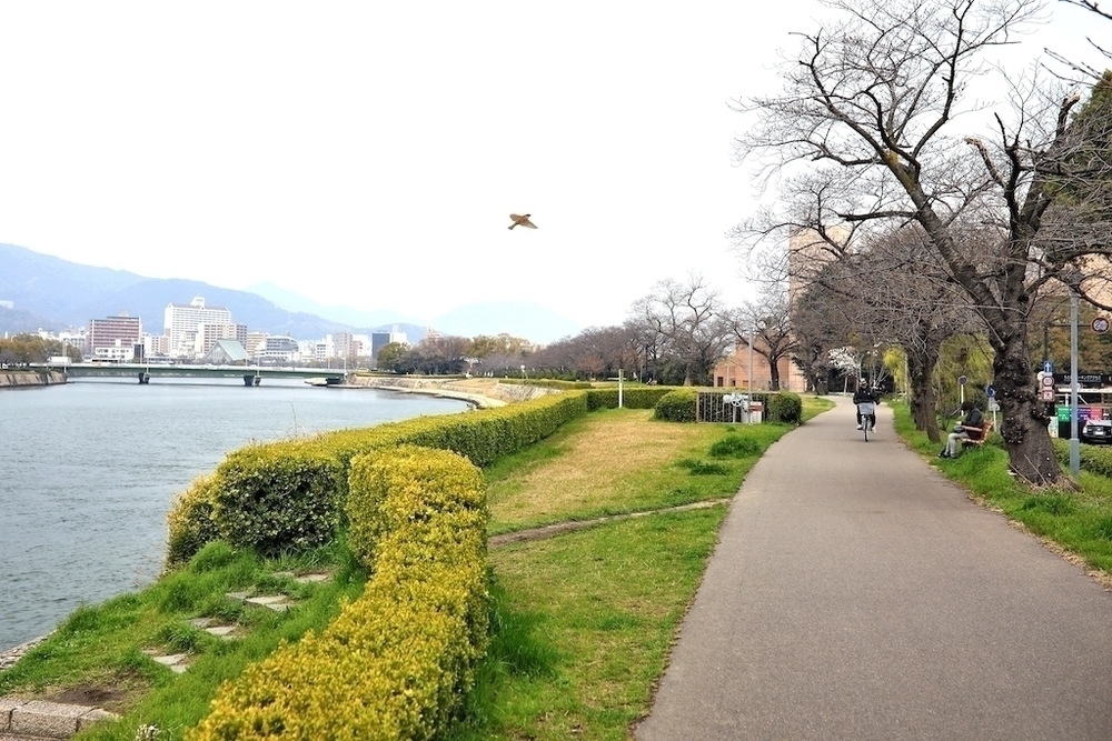 広島市の観光地をグルッと巡るランニングコースです。まずは横川の駅をスタートして旧太田川沿いに南下していきますが、川沿いは観光地に比べて走りやすい道となっています。そうすると遠くに原爆ドームの姿が見え、原爆ドームや平和記念公園では「戦争と平和」について学ぶことができます。