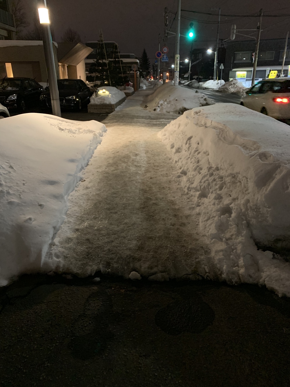 北東側はカチカチ(氷とアスファルトの段差大)、その他はシャリシャリな雪道。信号は8個くらい?