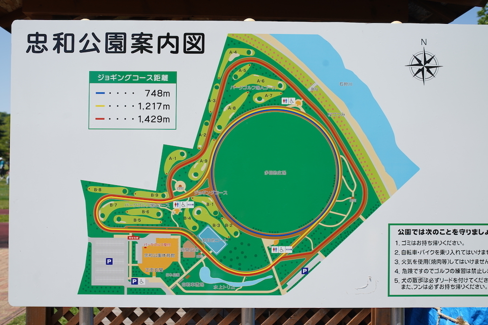 北海道旭川市の忠和公園には3種類の長さの周回コース(748m、1217m、1429m)の全てにゴムチップ舗装がされており、