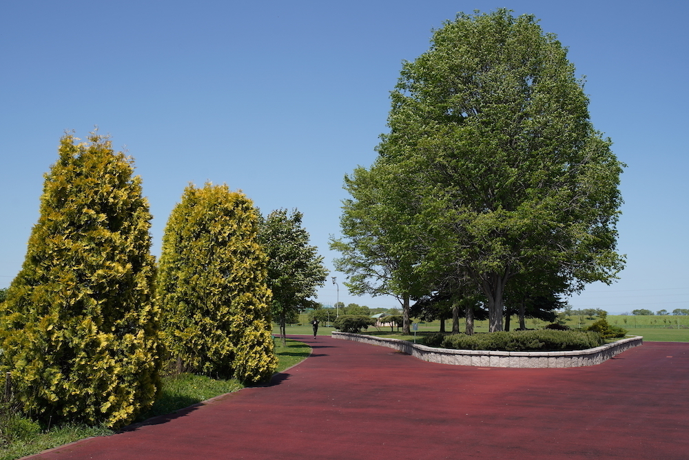 第二印象は「走路の赤と木々の緑と空の青と白樺の白が絶妙!」