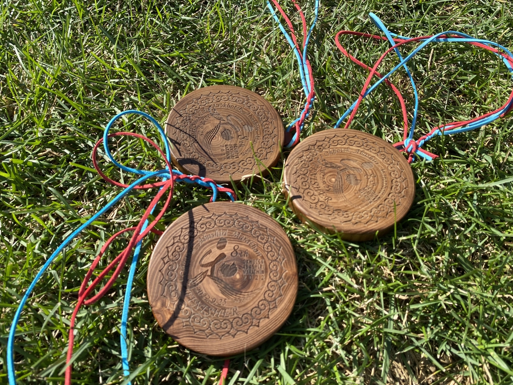 網走刑務所前をスタートし、すぐに鏡橋で網走川を渡り、網走駅前で再び網走川を渡り返してしばらく市内を進むと、眼前には遠方に知床半島のシルエットが浮かぶオホーツク海。山間部のアップダウンは結構きついが、木漏れ日の中を進むと気持ちいい。そしていよいよ、このコースのハイライトである能取岬へ。突端にある灯台をぐるっと一周して、オホーツク海を右手にみて進むと能取湖畔へ、最後は網走湖の長い登りのサイクリングロードを抜けると、この日に合わせて満開した260万本のひまわり畑を走り抜けたところにあるゴール。エイドも2k毎に給水以外に、これでもかというくらいの名産品。とどめはあばしり和牛と姉妹都市の天童市からのマスカットでした。ゴール後にも芝生広場の周囲に沢山の出店が立ち並び疲れた身体に栄養を充填。メダルは刑務所内で彫られた木製、木目や形は同じものはなく世界で唯一無二です(2022大会)。こんな素晴らしい大会なかなかないです。