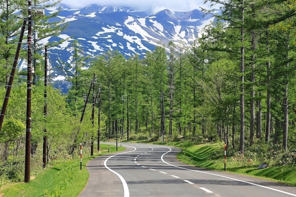 白金模範牧場あたりでは東南方面に十勝岳が綺麗に、かつ大迫力のアングルで見れる。天気が良く、かつ残雪がある季節は最高の眺め。青い池に戻る下り道を進み、左折した先には、私のなかでは美瑛でトップ5に入る美しい道(トップ画)がある。紅葉の時期に来たら感動で言葉も出ないだろうなぁ...