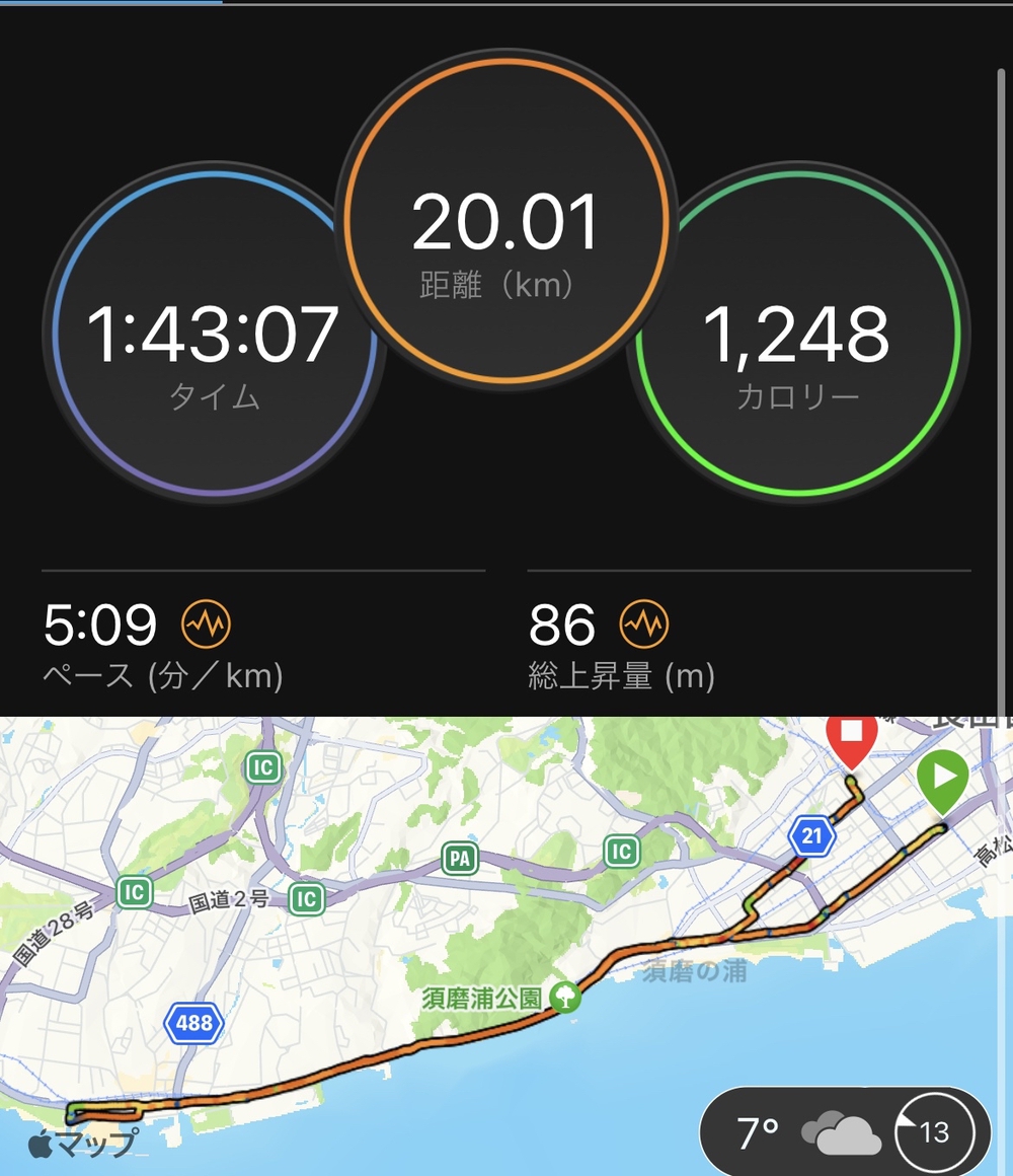 毎週行っている舞子公園までのランニング。今日は往復20キロ