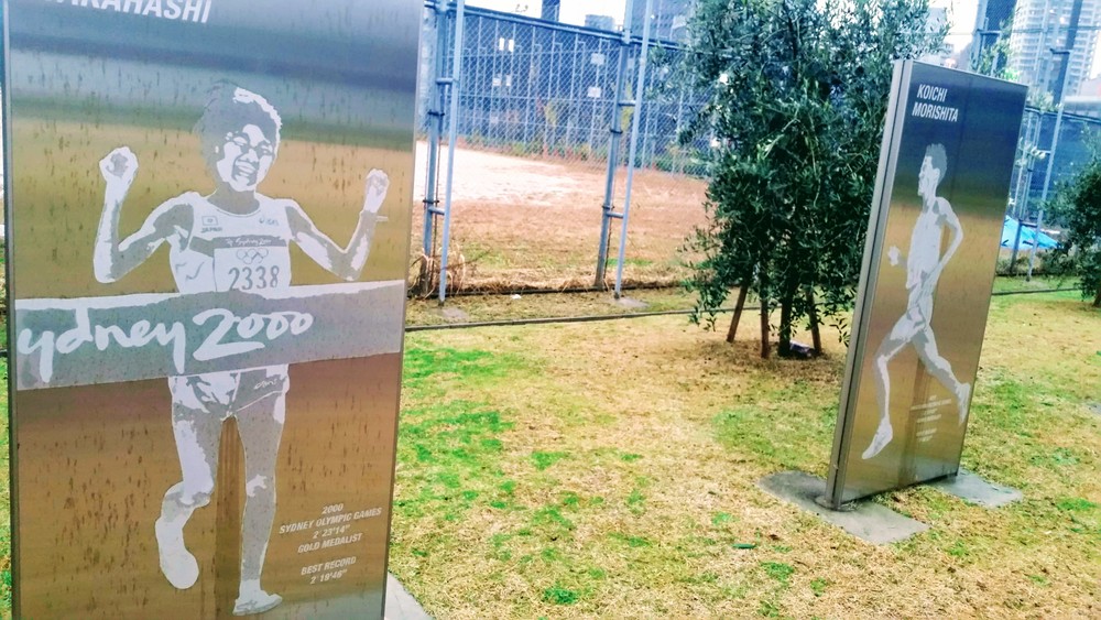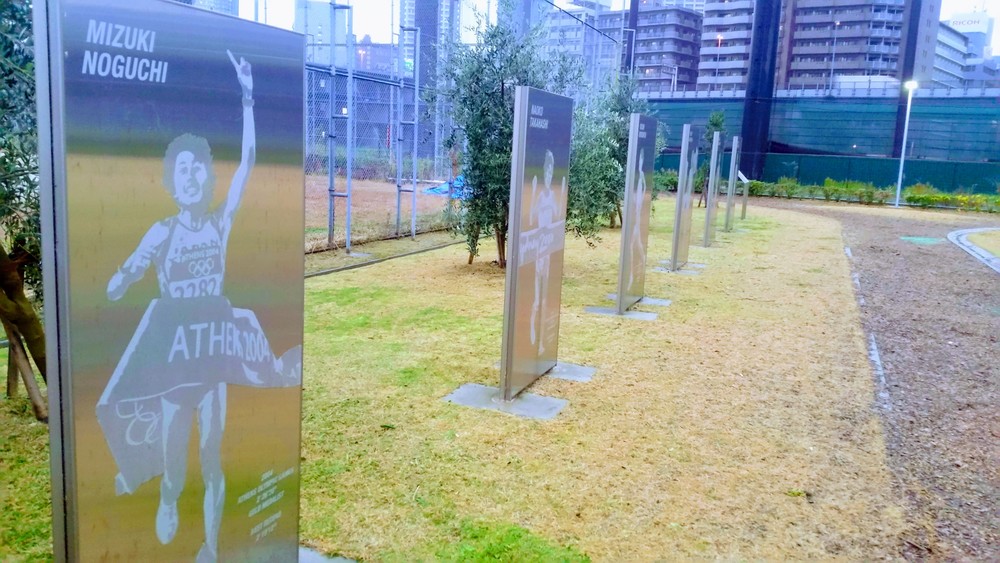 小野浜公園には神戸市とアシックス共同整備した周回500mのウッドチップコースと有森さん、高橋さん(Qちゃん)、野口さんを一とした歴代メダリストのモニュメントがあり、テンション上がります!