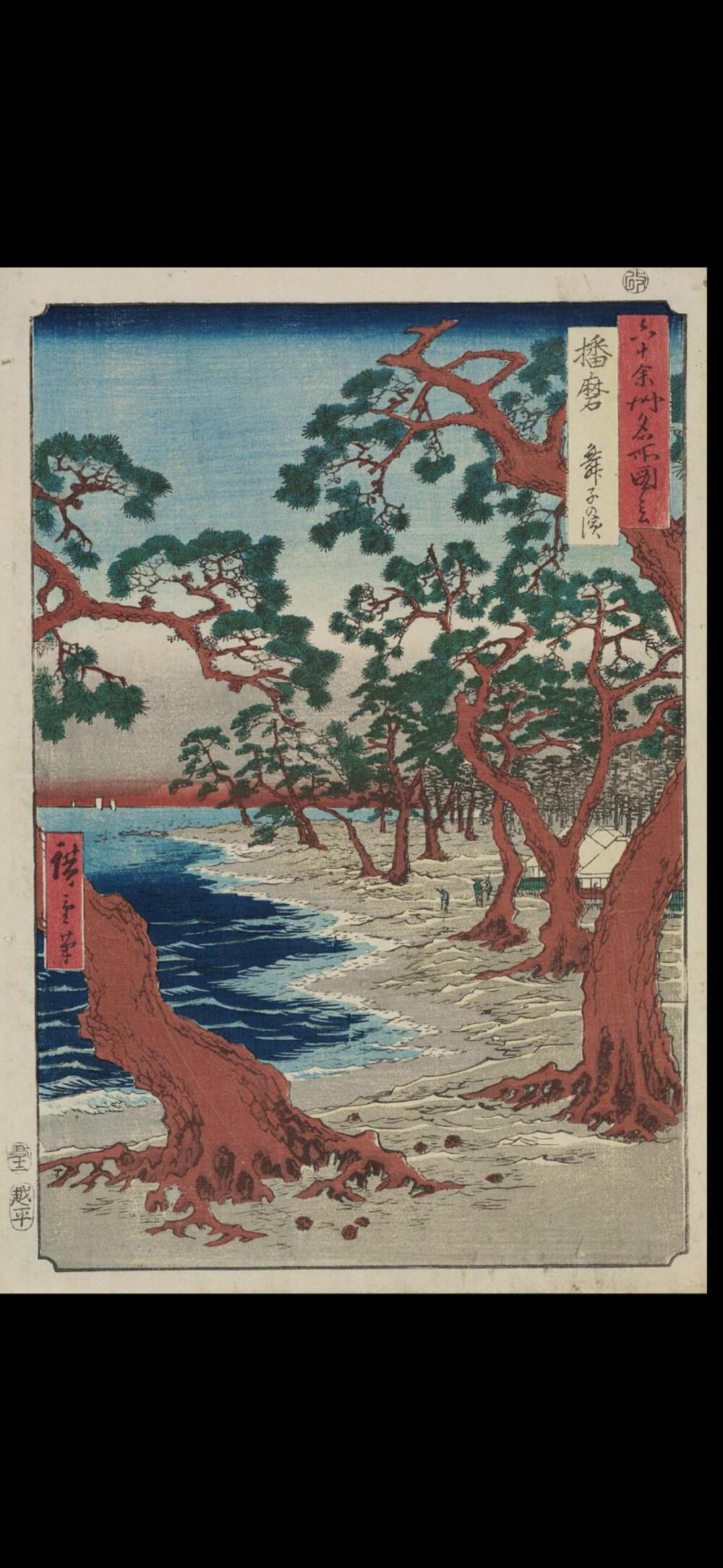 舞子の浜は、明石海峡を挟んで最も淡路島に近く、その眺望の良さもあり、多くの人が訪れたそうです。広重も浜ノ茶屋から淡路島を眺める人々を描いています。それに比べて、手前の松の木を大きく描き、遠近感を出しています。