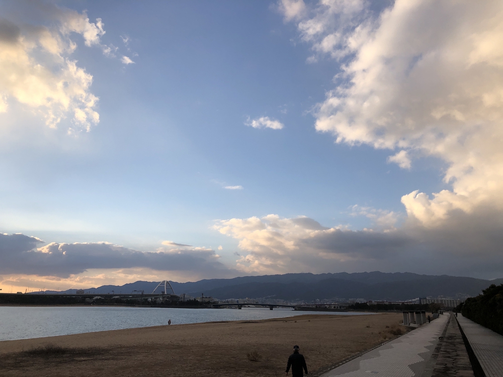 甲子園浜海浜公園前の道を端まで向かい、端から公園へ入り、折り返します。橋を渡って今津浜公園へ入り、浜甲子園のふるさと海岸を海辺を眺めながら端まで向かい、折り返して、今津浜公園を突き抜けます。そこからえびすの湯に戻る10kmのコースです。