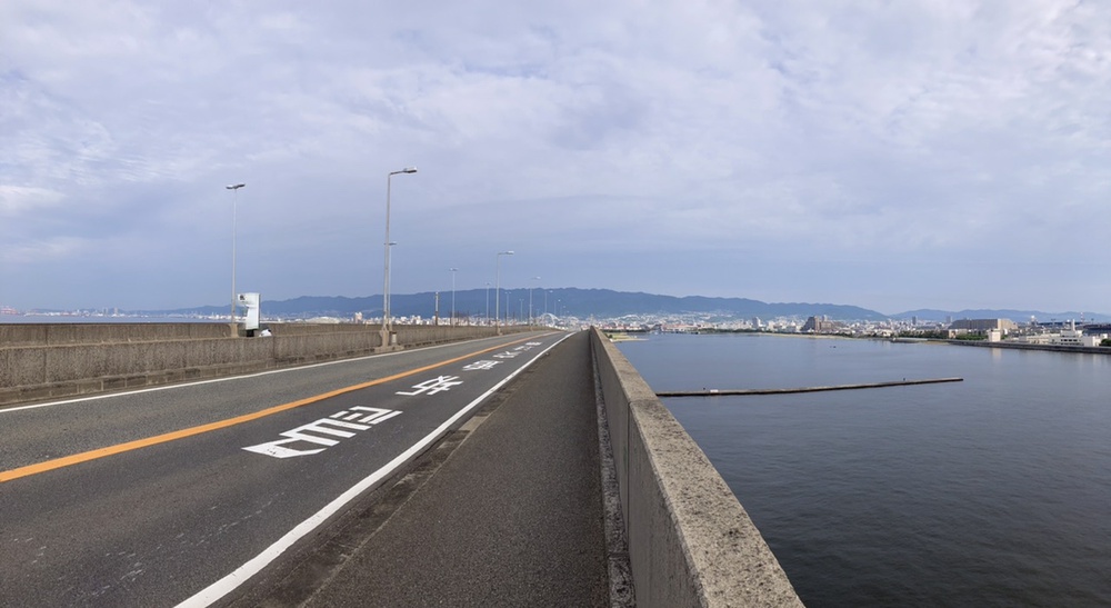 大阪湾と六甲山の絶景を見ながら橋を越えて行きます。西宮浜で信号幾つかぶつかります。最後の東灘芦屋大橋の上りが特にハードですが、越えた後は爽快下り。