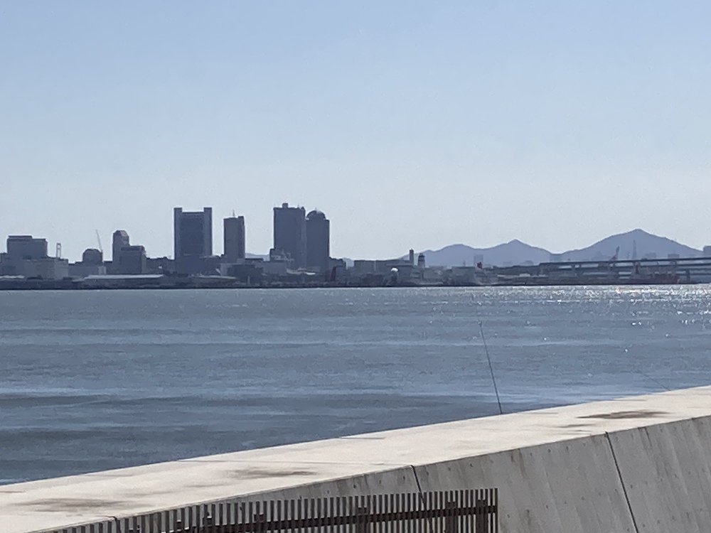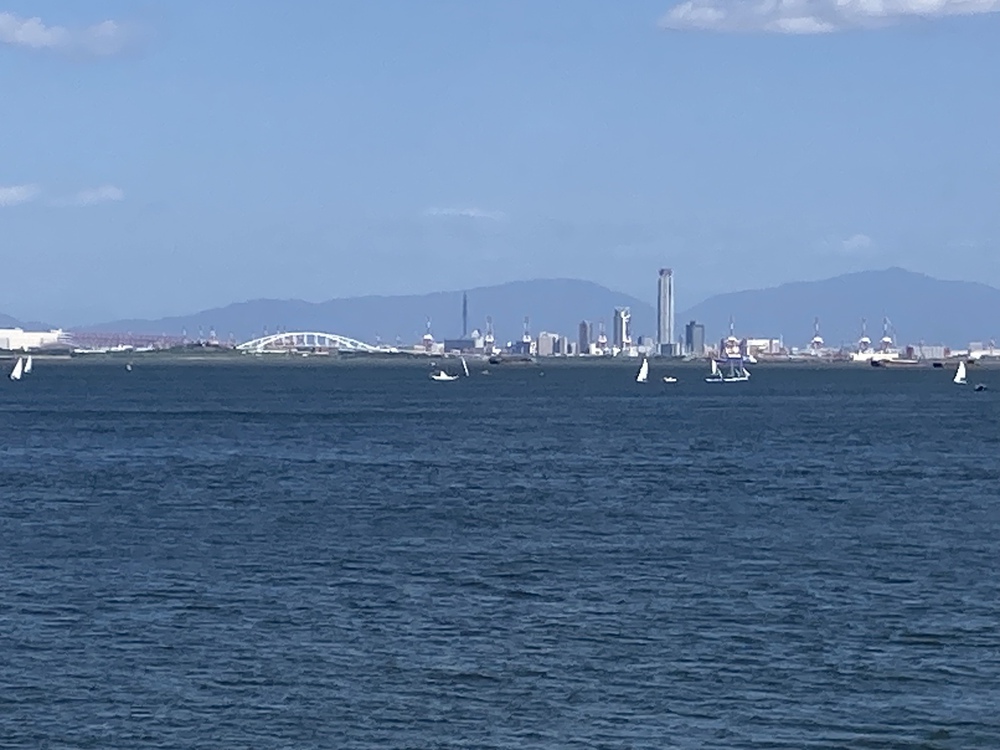 芦屋浜の総合公園と防波堤に沿って往復しました。工事完成直後で白いコンクリートが日差しで眩しい。遠く大阪湾の反対もよく見えます。