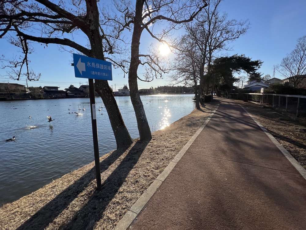 JR常磐線の赤塚駅から1kmほどの場所にある大塚町公園は、水辺の水鳥が美しい1周2.5kmの周回コースを散歩する人やジョギングする人で賑わっています。