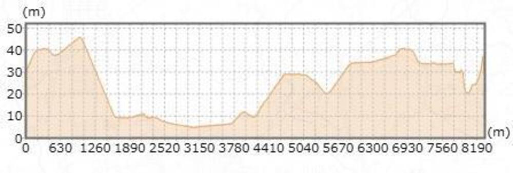 コースの上り最大傾斜は、時計回りで6%、反時計回りで3.5%、高低差40mぐらいです。(地理院地図電子版より)