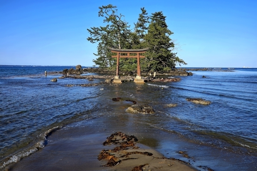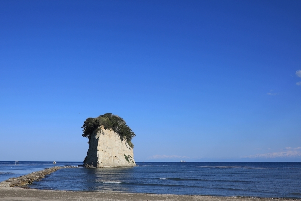 恋路海岸(こいじかいがん)は、悲しい恋の伝説が残る海岸ということからその名がつけられ、ここから見附島までの海岸線は「えんむすビーチ」と呼ばれています。恋路海岸の入り口には沖に浮かぶ弁天島と鳥居が印象的です。