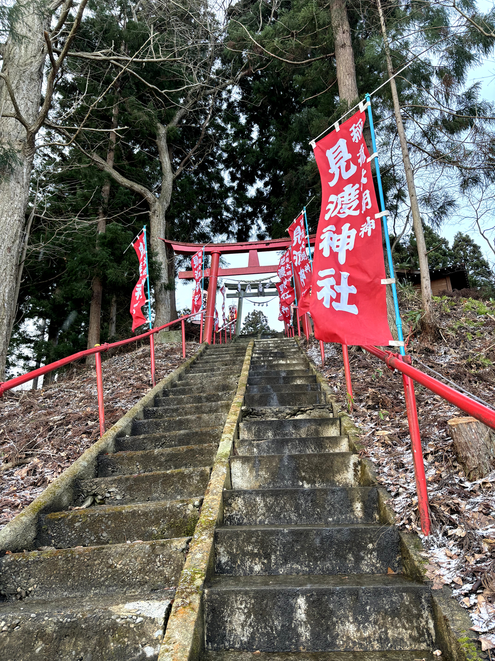 鬼柳町内の大きな神社(八幡・白髭・見渡)を参拝できるルートで舗装路、無舗装路、石段などの高低差いろいろ楽しめます