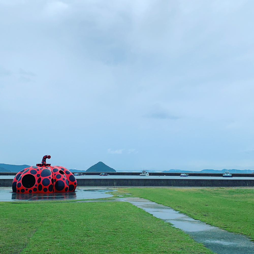 草間彌生の作品は、黄南瓜は流れ去ってしまったけど、赤南瓜が宮之浦港で出迎えてくれますよー