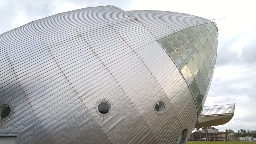 地元鹿児島の建築家、高崎正治氏の設計によるこの建物、ある部分は中華圏の意匠を彷彿とさせるかと思えば、旧式の宇宙船のようなレトロフューチャー感を漂わせていたり、と、なんとも独特の風情があります。