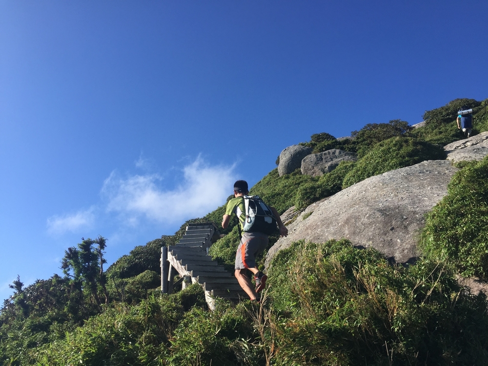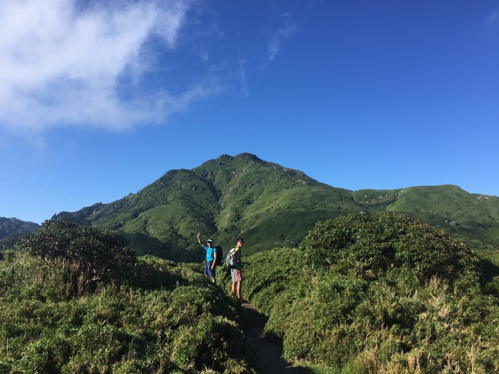急登はあまりないし、標準タイムを目安に進むと、スタートしてから3時間半くらいで宮之浦岳山頂へ。昨日は曇りがちな天気だったが2日目は快晴。山頂からの眺めもとても良い。我々が到着した時点では山頂には誰もおらず、しばし山頂からの眺めを独占。