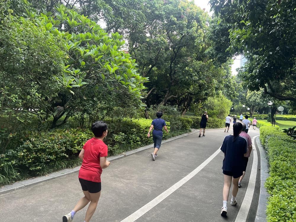 この公園では9割がウォーキング、1割がランニングという比率で、中国南部で健康に興味を持っている人が多い事がよくわかる。平日の朝の場合(私が走った時は)年齢層は老若男女であり、ランナーはエリートレベルではなく大半がジョガーだった。