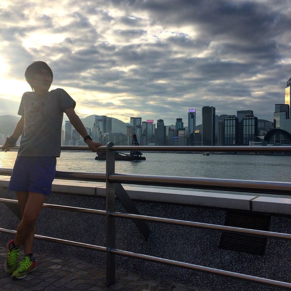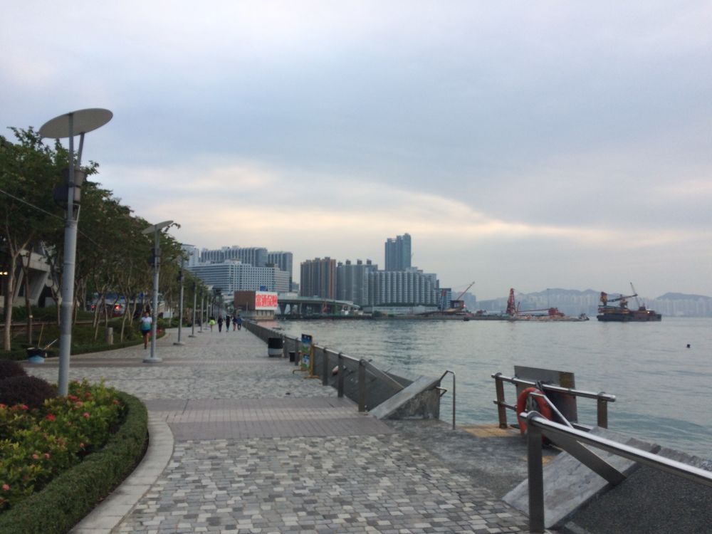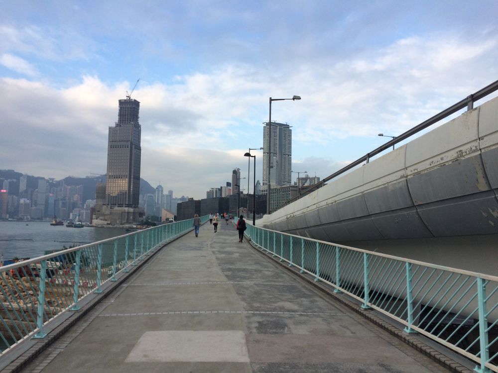 起点はスターフェリーと呼ばれる船着場(トイレあり)から反対端のプロムナード終点までは片道約4km、往復で8kmと手事な距離。行きは海を挟んで右手に香港島の高層ビル群とその向こう方昇る朝日を眺めながら、帰りは左手に眺めながら走ることができます。途中1箇所大きな坂道(高速道路のような道を行きます。僕は高所恐怖症なので実はここで足がすくんでしまうのですがこれも旅先のルートならでは。)がありますがそれ以外は平坦なのと一本道ですので初めての人でも安心です。2016年12月現在、工事をしている箇所があり、一部迂回が必要ですが工事箇所に迂回路のルートがきちんと張り出してあるので心配ないでしょう。