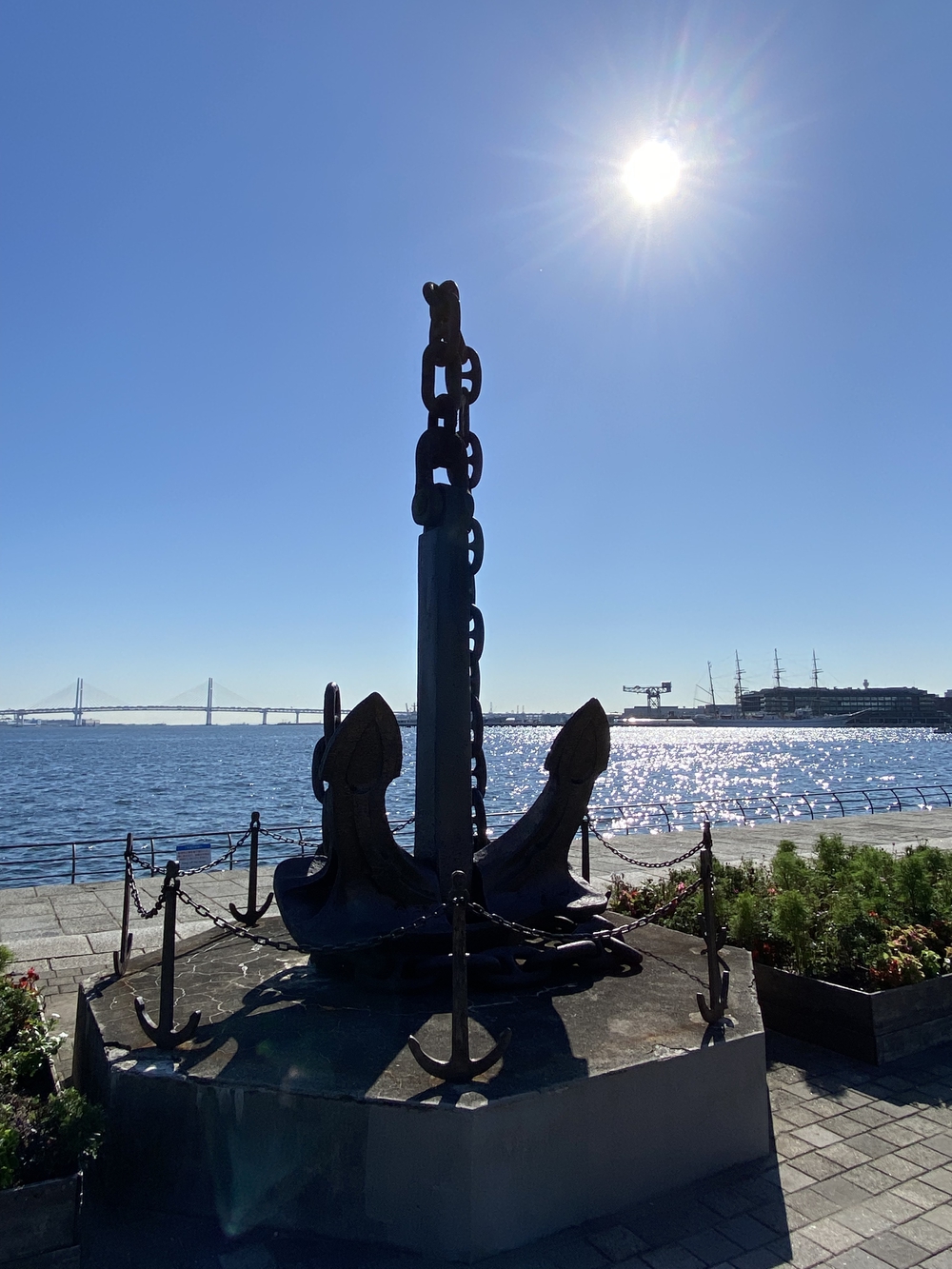 1つめの錨のモニュメントは、左手の高島水際線公園にあります。少し小さな錨です。みなとみらい21中央地区土地区画整理事業の造成工事中に発見されたものとのこと。