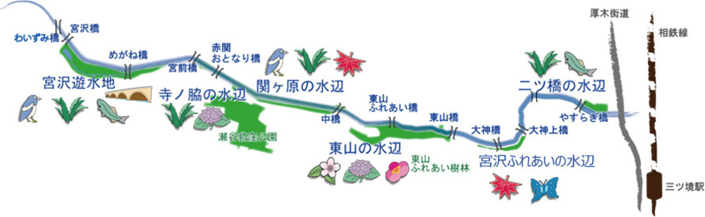 三ツ境から5分(走って?)にある二ツ橋水辺スタート。川の東側は朝は日陰。夏場のランニングに最適。ですが、途中で行き止まりになるので好きなコースを探ってください。宮沢遊水池までは3km。小さな池にフナ釣りの方が一年中釣りを楽しんでいます。宮沢橋まではまた3km。あじさいの道があったり、和泉川にはよくカワセミを見かけます。いずみの駅の近くには養鶏場があり、新鮮な卵を売っています(ラニング途中なので買ったことはありませんが)。いずみ野駅で折り返し。アップダウンはなくとても走りやすいです。