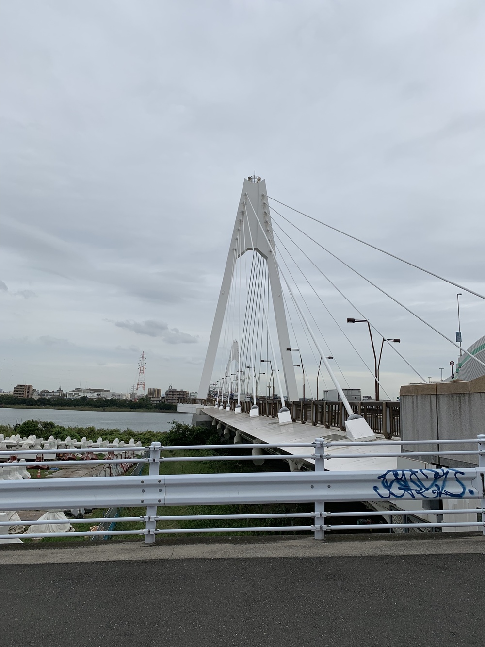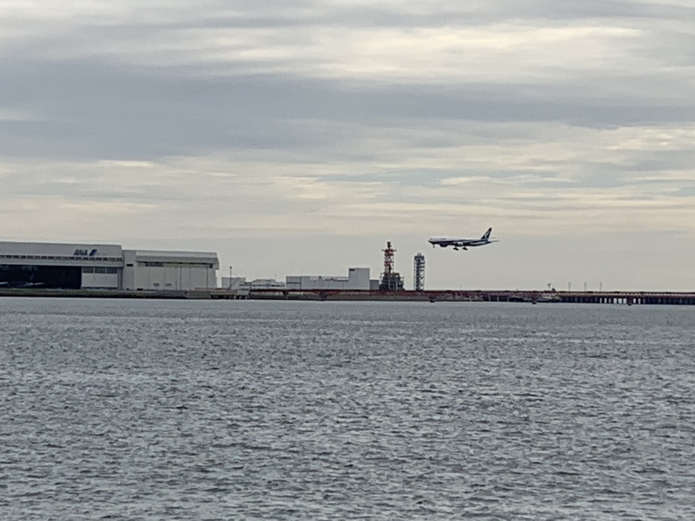 川崎駅前から、多摩川を下って、河口まで行くと対岸に飛行機が、見えて、モチベーションアップ