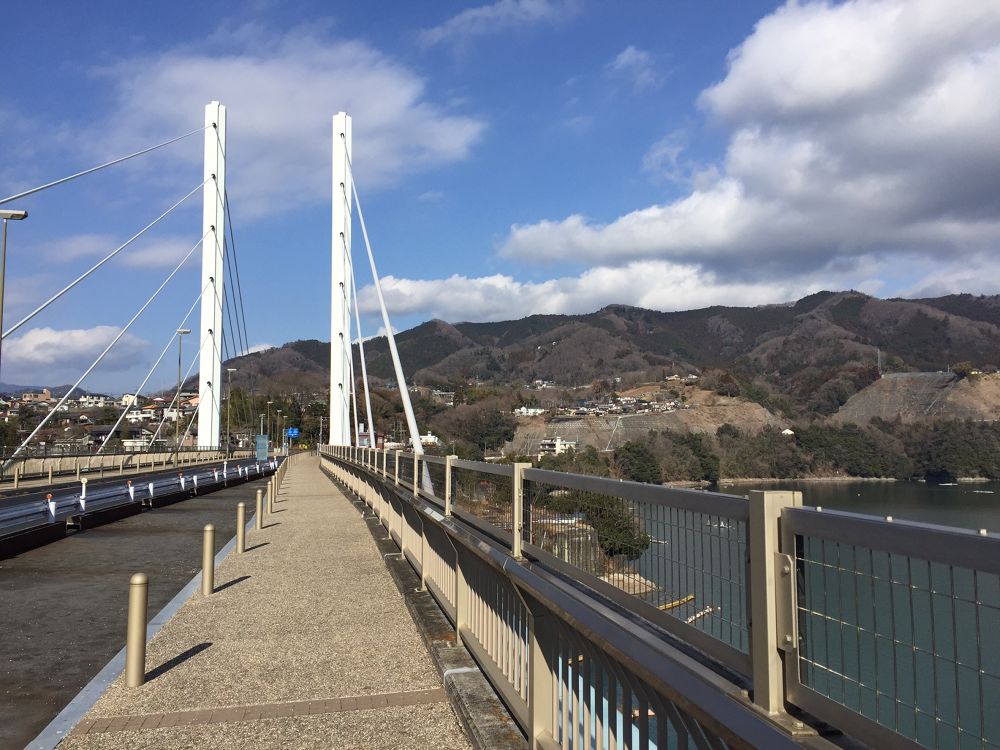 相模湖リゾートプレジャーフォレスト内にある日帰り温泉うるりを起点に相模湖方面へ、一部国道20号線を走るので、車には注意が必要。勝頼橋を渡り右折だとそのままロード、左折すると約2kmほどはトレイルを楽しめる。藤野南小学校から起点になった相模湖リゾートまでは起伏が激しいロードで足の鍛錬には最適である。