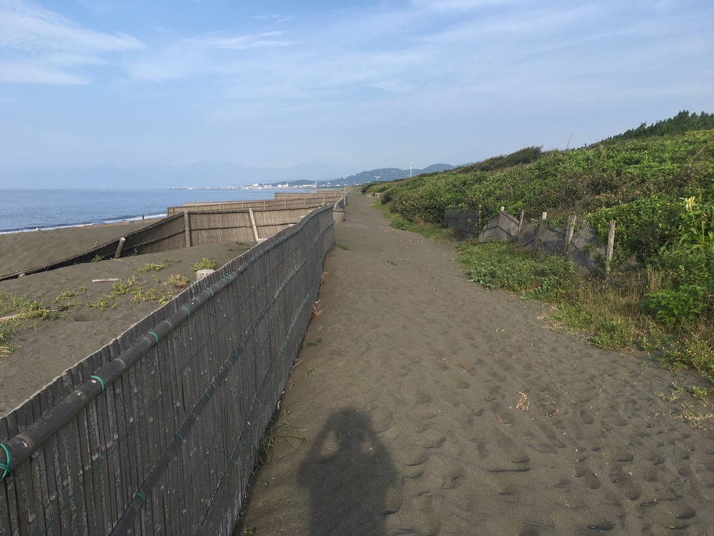 波打ち際は、釣り人、サーファー、海水浴客が居て走れませんが、このコースは段上なので煩わしい所が無いです。途中、硬めの部分、草が生えた部分等有りますが、柔らかい砂部分も選べます。