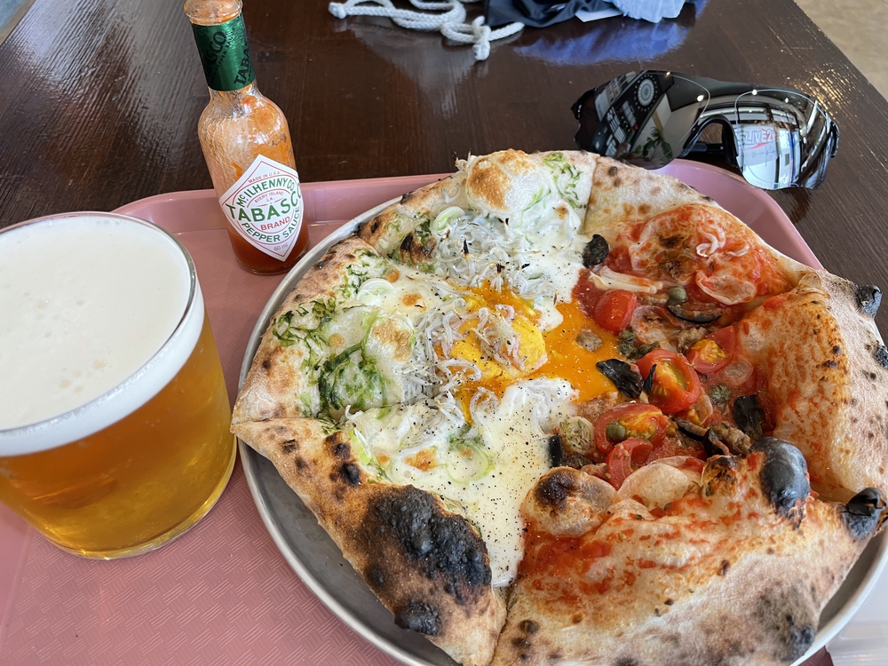 駅前の「ピザ食堂」で干物とシラスピザに御約束のビール (二杯!)。もちろんお寿司屋さんや魚介の居酒屋さんも沢山あります。