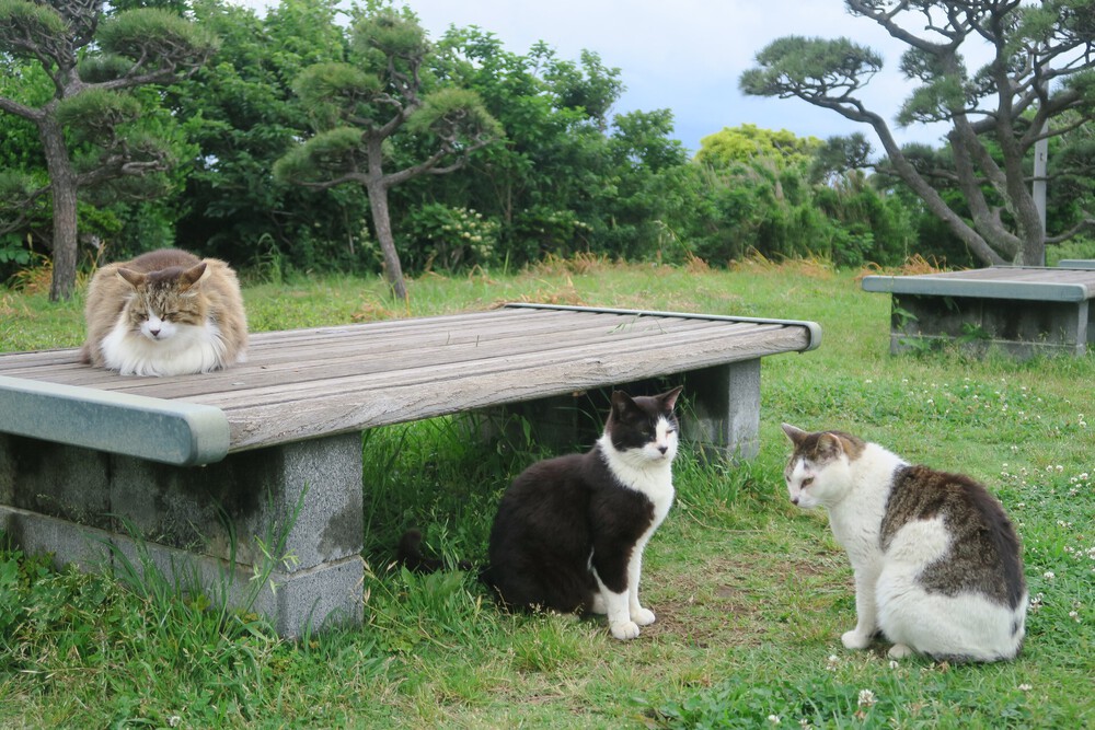 そして、城ヶ島公園へ。この日は第二展望台まで行って戻りましたが、旧安房崎灯台跡まで岩場を歩くことも可能です。公園管理事務所の近くにトイレや大きな駐車場があります。その駐車場の北側に、ニャンコたちが皆さんお揃いでいらっしゃいます(なんと、Googleストリートビューにも写ってる!笑)