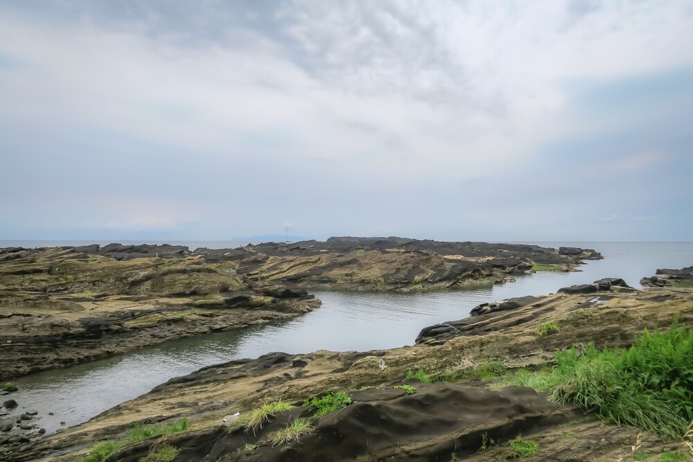 磯料理のお店のある道をそのまま南下して、左折するとトイレと階段があり、階段をのぼると快適なトレイルに出ます。道幅は狭いので、混んでいる日は、ウォーキングで。緑とピンクのクリップが寄り添っているようなオブジェがあるのが、みはらし広場です。ここから少し行くと、馬の背洞門に降りることができます(岩場に降りたくない場合は、そのまま東に進むこともできます)。