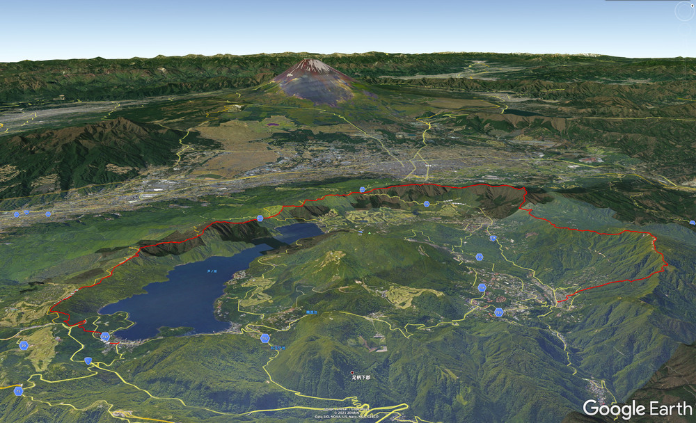 外輪山約半周のトレイルランです。ところどころで給食、給水(自販機)できます。ガーミン計測で累計獲得標高2,301m。