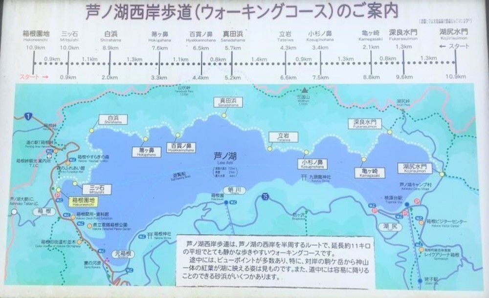 芦ノ湖は1周約20km。このコース紹介は、元箱根港のコインロッカーに荷物を置いて湖の反対側の湖尻港まで遊覧船で行き、ハイキングコースとなっている西岸で自然の中の不整地ランを楽しむコースです。(遊覧船で移動する分が余分に距離にカウントされて表示されていますが、脚で移動する距離は12km程度です。)元箱根港にある箱根駅伝往路ゴールを目指して走ります。湖尻港の近くには芦ノ湖キャンプ村があり、お手洗いや自動販売機もあります。しかし、そこからゴールの湖尻港までは売店や自動販売機はないので気を付けてください。湖を眺めながらの不整地ランはとても気持ちよく、おすすめのコースです。観光地ということもあり、元箱根では名物などおいしいもを食べることができます。箱根は温泉で有名ですので、ランニングの後に温泉をたのしむプランもおすすめです。