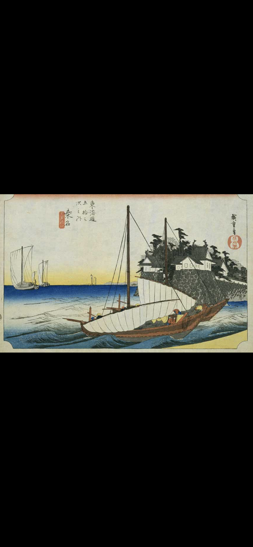 広重の「東海道五拾三次」から「桑名宿」を巡ります。宮宿と桑名宿の間には、木曽川、長良川、揖斐川のいわゆる木曽三川が流れており、これらの川を渡る不便さを避ける為に、海上を舟で渡る「七里の渡し」がありました。