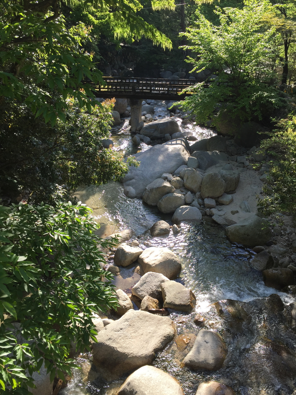 新緑のトレイルを汗だくで走って、蒼滝を眺めに。御在所岳を見上げながら宿へ戻って温泉へ直行。あー、気持ち良い!