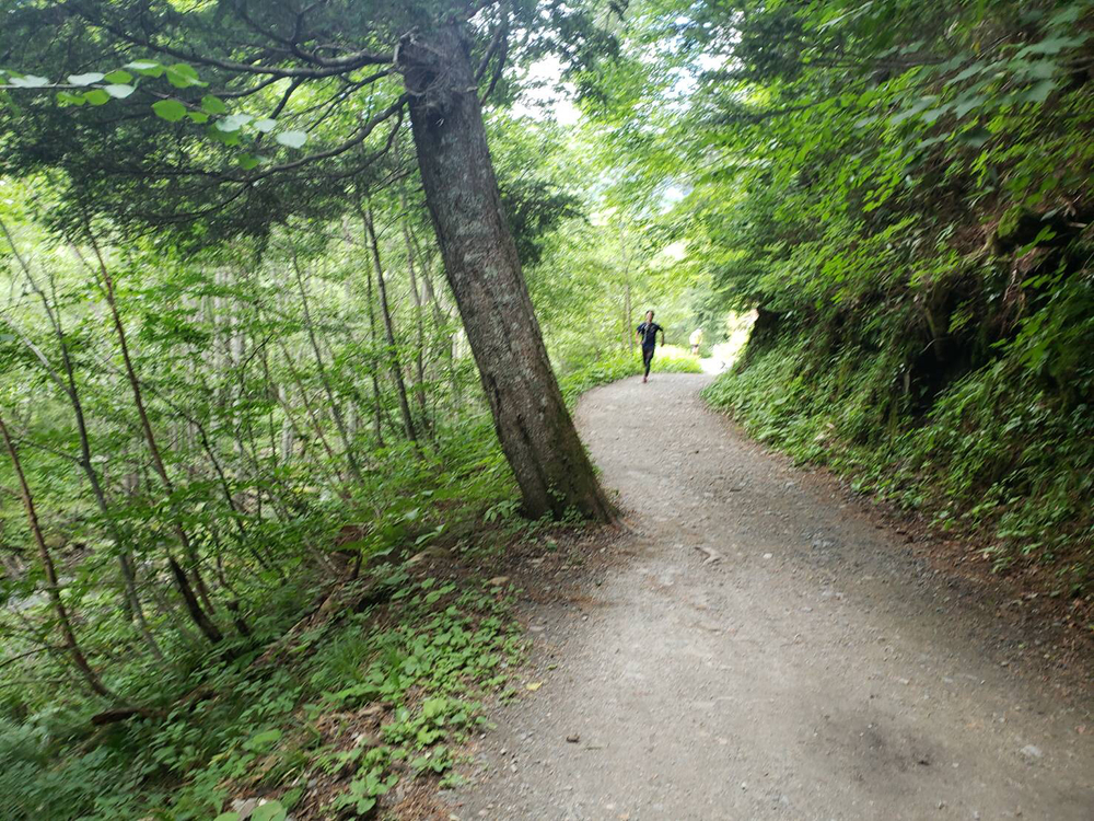 上高地→前穂高→奥穂高→涸沢岳→北穂高→涸沢ヒュッテ→徳沢を通り上高地にまで戻ってくる約28Kmのコースです。全行程の中で走れるのは涸沢ヒュッテから上高地までの下り約13kmでその他は山登り。景色は最高ですがかなり険しいコースです。途中、奥穂高や北穂高の山小屋で補給できますが携帯食と水分は必ず持って行きましょう。