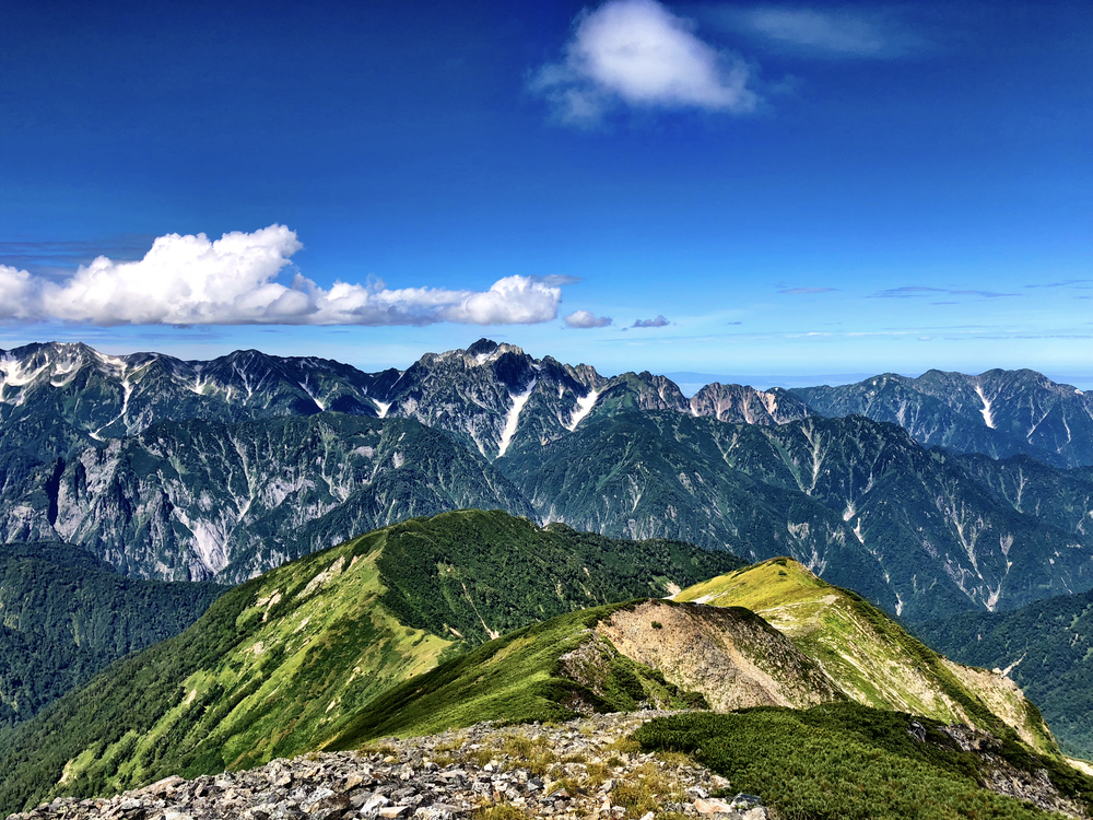 扇沢駅から柏原新道を登り、爺ヶ岳を経由して鹿島槍ヶ岳の北峰まで。剱岳を目の前に、天気が良いと日本海や富士山まで望めます。