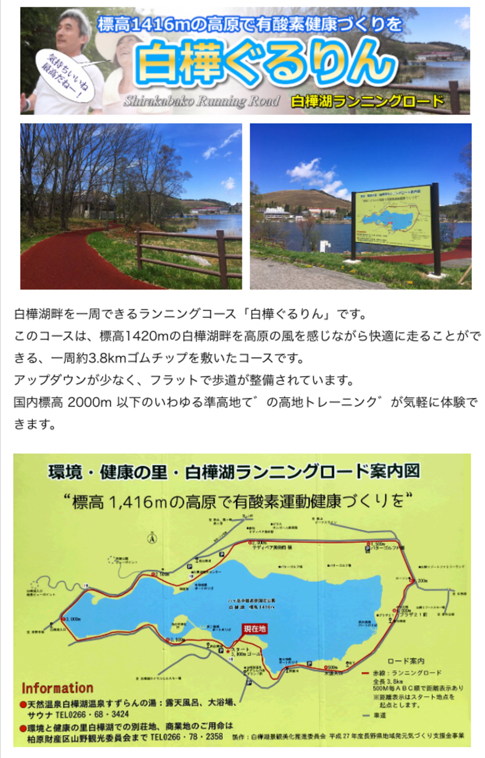白樺湖の周りのランニングコース。1周3.8kmの景色が良くとても走りやすいコースです。標高1416mで高地トレーニング、有酸素運動で体力づくり!