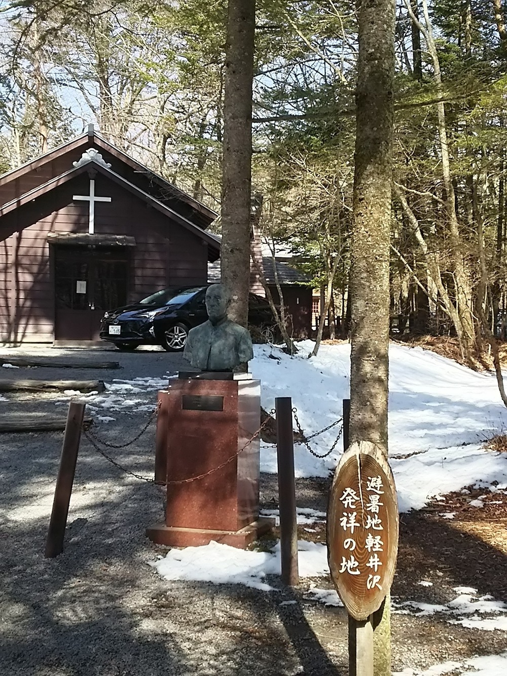 メインは、軽井沢ショー記念礼拝堂です。ショーとは、軽井沢開発の父といわれるカナダ人宣教師アレキサンダー・クロフト・ショーのことで、軽井沢が気に入り、彼が建てた別荘が軽井沢第1号の別荘だったそうです。この礼拝堂の原形は1895(明治28)年に軽井沢最初の教会建造物として建立され、今日に至り、今もミサが行われています。